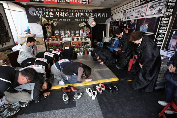 용산 참사가 일어난 남일당 건물 1층 분향소에서 시민들이 유가족들에게 절을 하고 있다.