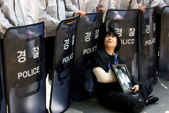 용산 참사로 숨진 고 윤용헌씨 부인 유영숙씨가 지난 4월28일 청와대 앞에서 기자회견 뒤 유족들의 질의에 대한 청와대 답변서를 받으려 청와대 진입을 시도하다가 경찰에 가로막혀 있다.