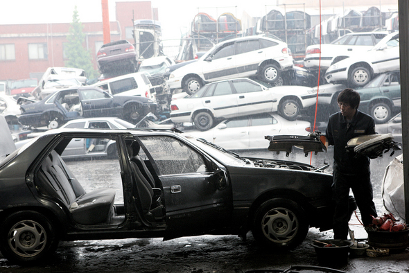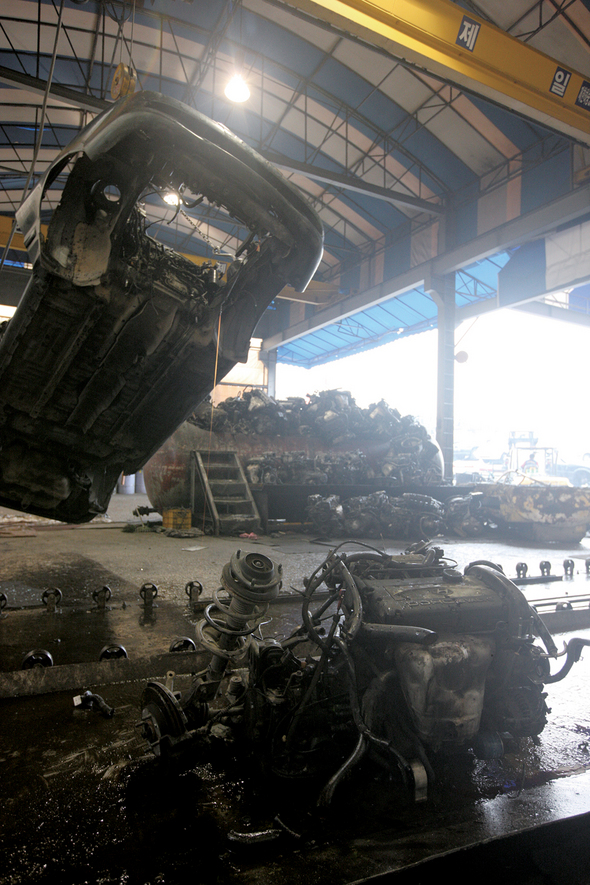 2008년 한 해에 국내에서 약 67만대의 자동차가 폐차됐다. 인천 남동구 논현동 인천폐차사업소에서는 오늘도 수명을 다한 자동차들이 지게차에 실려와 작업대에서 각 공정을 거치며 앙상해져 간다. 먼저 전조등이나 문짝 등 재활용할 수 있는 부품을 수거한 뒤 타이어를 떼어내고, 배터리·프레온가스·연료를 제거한 뒤 엔진·서스펜션 등 부품을 하나하나 분리한다. 마지막에는 앙상한 껍데기만이 남아 프레스 기계에서 압축된다. 한 대의 자동차가 분해되는 데 30분이면 족하다.