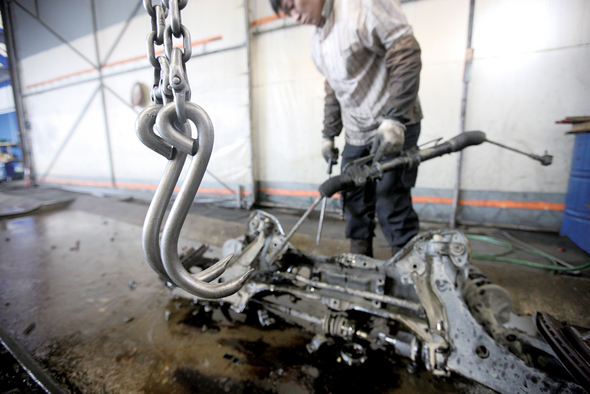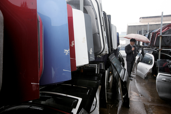 본격적인 폐차 작업을 시작하기 전 재활용할 수 있는 부품들을 모으고 있다.