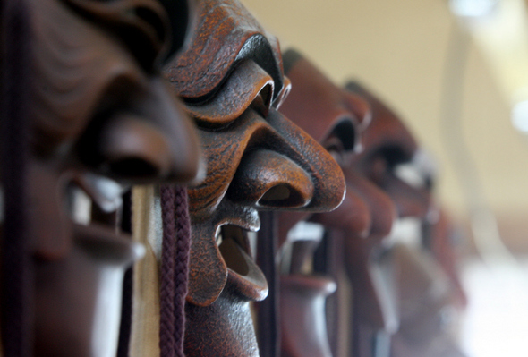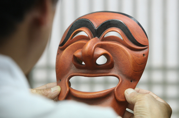 “양반은 체면과 허풍입니다. 곧 죽어도 아프다는 말을 안 해요. 그 표정이 여기에 담겨 있습니다.” 탈에 턱끈을 조여매던 김동표(58)씨가 양반탈에 대해 설명했다.