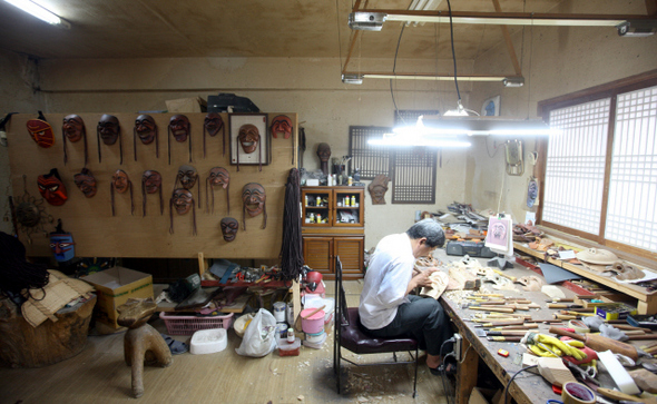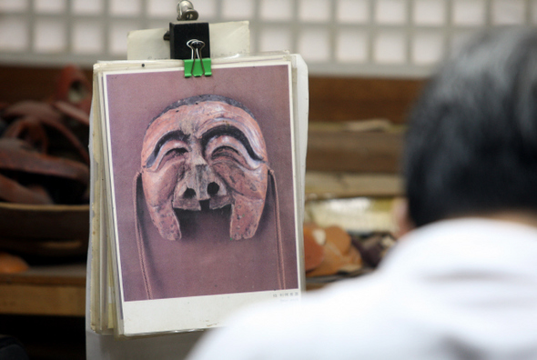 작업장 책상 앞에 국립중앙박물관에 보존된 국보 하회탈의 사진이 걸려 있다.