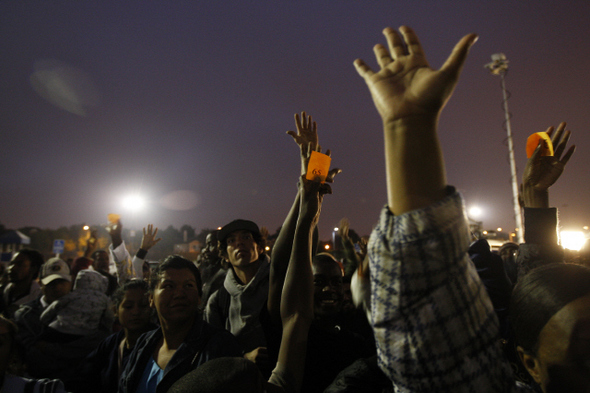 8월11일 새벽 잉글우드의 한 체육관에서 무료 진료를 받으러 온 환자들이 주황색 번호표를 들어 보이고 있다. 사진 RUTH FREMSON /THE NEW YORK TIMES