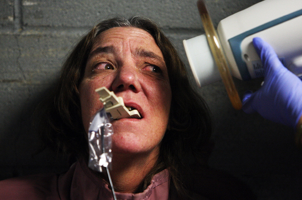 8월11일 미 캘리포니아주 잉글우드의 한 체육관에서 비영리 의료봉사단체 ‘리모트 에어리어 메디컬 볼런티어’가 진행한 무료 진료 행사에서 낸시 롬스테드(45)가 치과 진료를 받기에 앞서 턱 사진을 찍는 엑스레이 기기를 두려운 눈빛으로 바라보고 있다. 사진 연합 / THE NEW YORK TIMES/ RUTH FREMSON