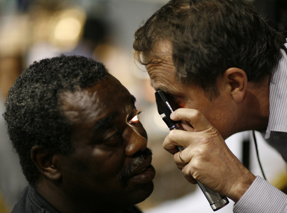 안과전문의 그레그 펄이 케네스 스판의 눈을 검진하고 있다. 사진 REUTERS MARIO AUZUONI