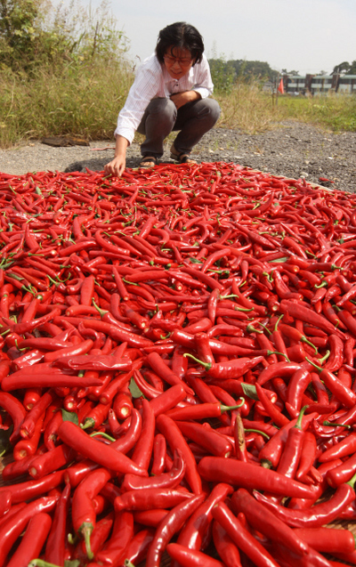 아직은 뜨거운 한낮의 햇빛에 널어놓은 고추가 탐스럽다. 경기 김포시 양촌면.