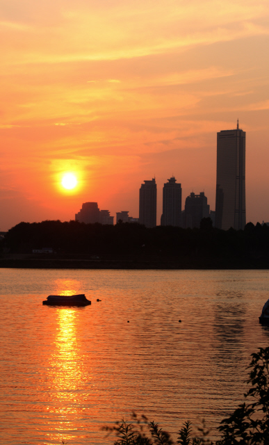 강가의 낙조는 하늘도 강물도 온통 붉게 물들인다. 서울 한강.