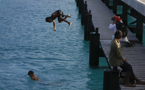 이선수(빨간 모자 쓴 이)씨가 9월30일 일데팽섬 선착장에서 바다로 뛰어드는 아이들의 모습을 찍고 있다.
