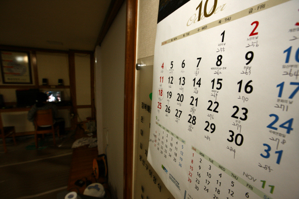 유족들이 머무는 남일당 인근 건물 벽에 참사 이후 경과한 일자가 펜으로 적힌 달력이 걸려 있다.