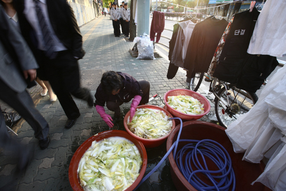 참사 현장인 남일당 건물에서 농성 중인 유족 가운데 한 아주머니가 김치를 담그기 위해 소금에 절인 배추를 씻고 있다. 옆으로 퇴근하는 직장인들이 지나가고 있다.