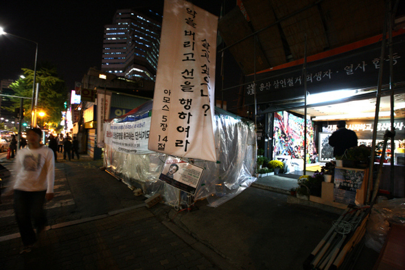 지난 10월21일 오후 ‘용산 참사’ 현장인 서울 용산구 남일당 건물 앞. 용산철거민참사범국민대책위 소속의 한 아주머니가 인도에 쭈그리고 앉아 소금에 절인 배추를 찬물에 씻고 있었다. 매일 김치를 담근다고 했다. 족히 20포기는 돼 보였다. 비닐 천막 안에서는 천주교정의구현전국사제단(이하 사제단) 신부들이 단식 농성을 하고 있었다.