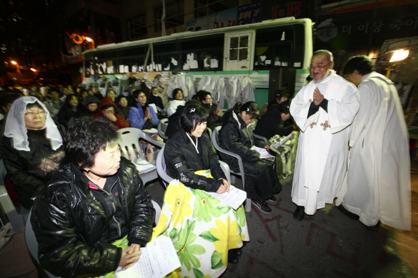 용산 참사 현장에서 매일 저녁 7시 미사가 열린다.