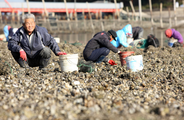 최도미자(70)씨는 해가 질 무렵까지 호미를 놓지 않고 굴을 캤다.