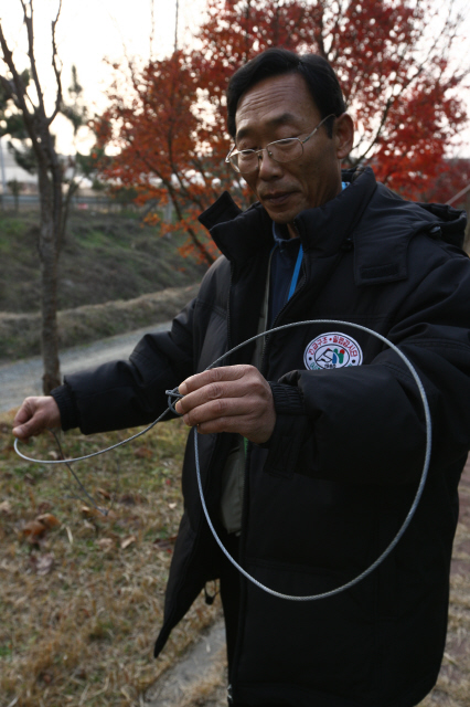 들에서 수거한 올가미를 김명수 부지부장이 들어 보이며 설명하고 있다.