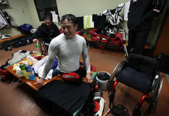 휠체어에서 내려 두겹의 날이 달린 썰매에 오른 선수들이 거친 몸싸움에도 견딜 수 있도록 몸을 썰매에 고정하고 있다.