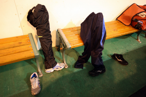 2010 벤쿠버 장애인 동계올림픽에 출전할 아이스슬레지하키팀이 ‘개썰매’라 부르는 순발력 훈련을 하고 있다. 뒤에서 끈으로 당기는 걸 뿌리치고 앞으로 나아가야 한다. 한 선수가 폴에 달린 픽으로 빙판을 찍으며 전진하기 위해 거친 숨을 몰아쉬고 있다.