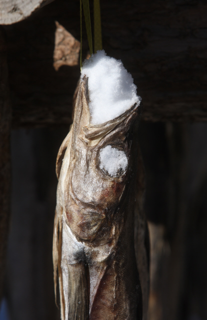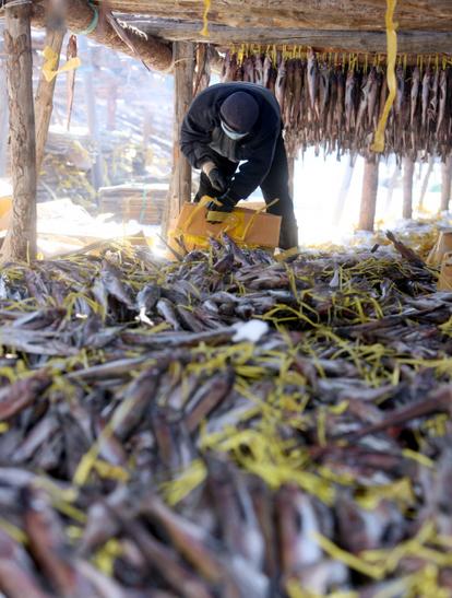 명태를 널고 있는 한 주민의 입김이 추운 날씨를 가로지른다.