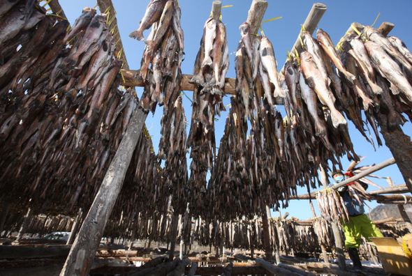 새로 들어온 명태를 정리하고 있는 주민. 이 명태들은 러시아산이 대부분이다.