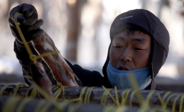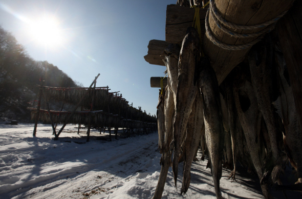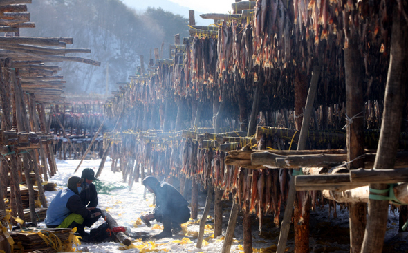 추운 겨울의 햇살을 받으며 얼기와 녹기를 수차례 반복하면 질 좋은 황태가 된다.
