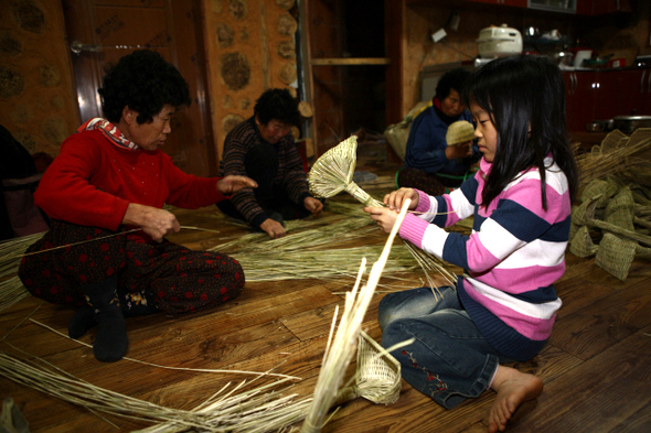 전남 화순 송단리 마을회관에 할머니들이 모여 조리를 만들고 있다. 한켠에서 일을 거드는 초등학교 4학년 혜강이의 솜씨가 제법이다.