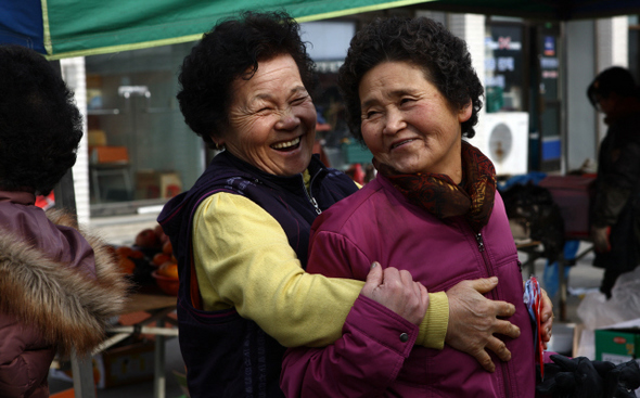 강원도 평창군 미탄 5일장을 보러 온 한 할머니가 아는 사람을 만나 반갑게 인사하고 있다.