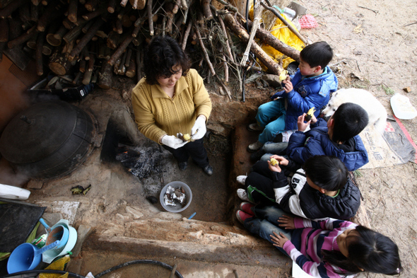 전남 화순 송단마을에서 한 주민이 군불 땐 아궁이에 고구마를 구워서 동네 아이들을 불러 먹이고 있다.