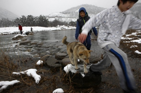 아이들이 철딱서니학교 뒤에 있는 용소골 계곡의 돌징검다리를 달려서 건너고 있다.