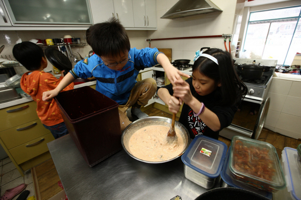혜진이가 김치전 반죽을 젓고 있는데 동생 동훈이가 “한 번만 한 번만” 하며 직접 저어보게 해달라고 조르고 있다.