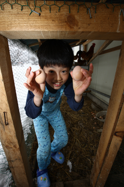 계란 당번 우철이가 방금 낳은 유정란을 들어 보이고 있다.
