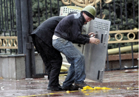 키르기스스탄 수도 비슈케크의 대통령궁에 진입하려는 시위대가 4월7일(현지시각) 방패를 들고 있다가 경찰이 쏜 총에 맞아 쓰러지고 있다. REUTERS/ VLADIMIR PIROGOV