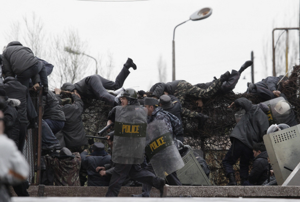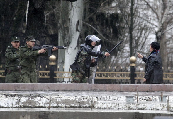 키르기스스탄 경찰들이 4월7일(현지시각) 수도 비슈케크 정부청사 주위에서 시위대를 총과 곤봉으로 위협하고 있다. 경찰은 이날 시위대에 발포해 수백 명의 사상자가 발생했다. 연합 AP