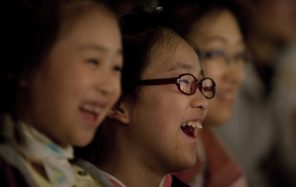혜인이와 다인이가 퍼시픽랜드에서 바다사자와 돌고래의 묘기를 보며 밝게 웃고 있다.