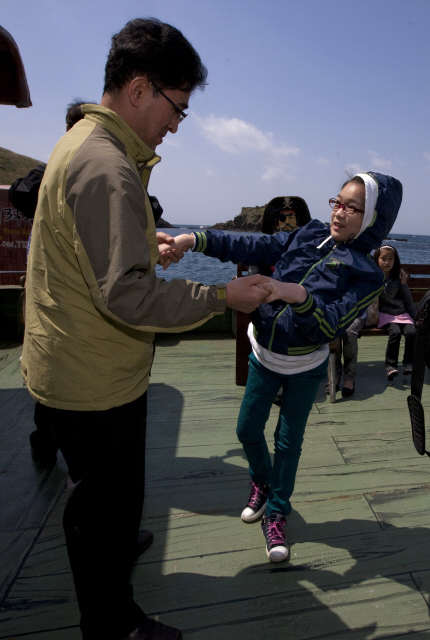 차귀도 잠수함 선착장에서 배를 기다리던 혜인이가 아빠 손을 잡고 걸음을 옮기고 있다.