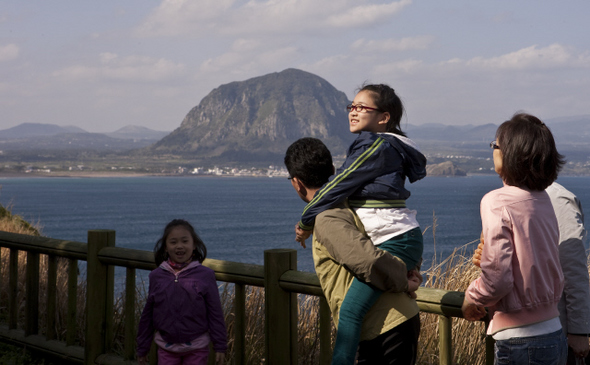 멀리 산방산과 바다가 보이는 송악산에서 혜인이가 아빠 등에 업혀 산책하고 있다.