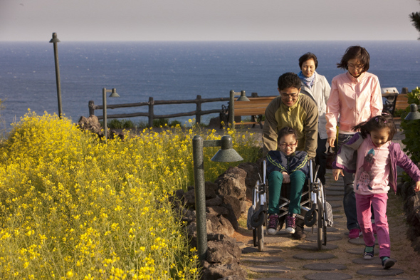 제주 서귀포 중문의 ‘쉬리동산’. 울퉁불퉁 불편한 길이지만 아빠가 밀어주는 휠체어에 앉은 혜인이의 얼굴에 웃음꽃이 피었다.