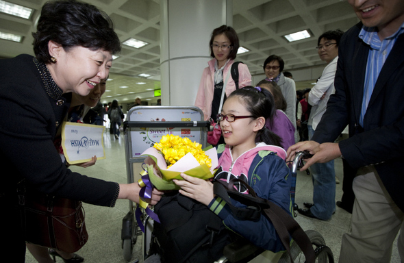 박은경 한국메이크어위시재단 사무총장(왼쪽)이 제주공항에 도착한 혜인이에게 꽃다발을 전하고 있다.
