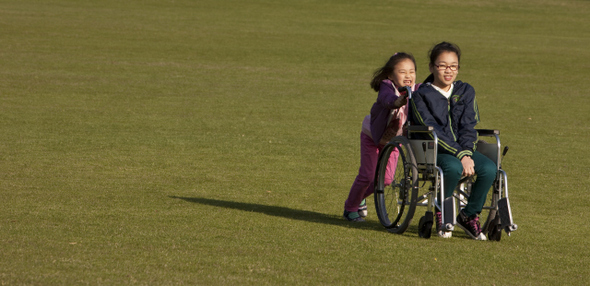 서귀포 여미지식물원 잔디밭에서 동생 다인이가 혜인이의 휠체어를 밀며 달리고 있다.