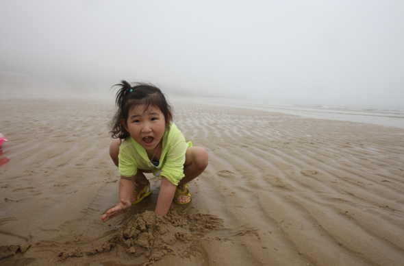 딸아이의 손을 잡고 백사장을 걷는 가족의 풍경이 정겹다.