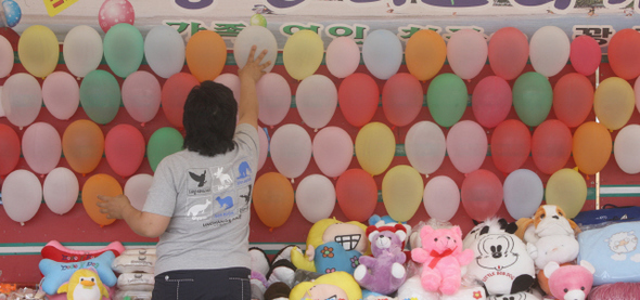 풍선 터뜨리기 게임장을 운영하는 여주인이 바람 빠진 풍선을 새 풍선으로 교체하고 있다.