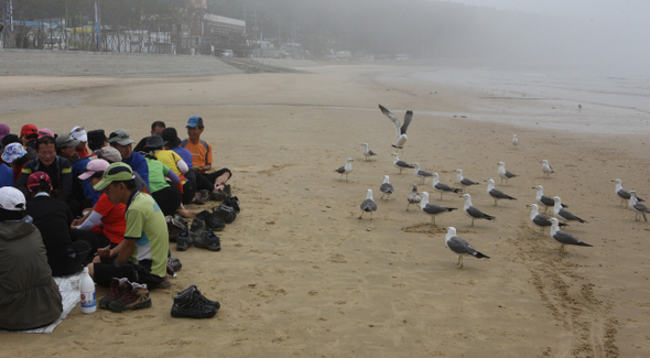 백사장에서 회식하는 사람들 옆으로 다가와 먹을 것을 기다리는 갈매기들.