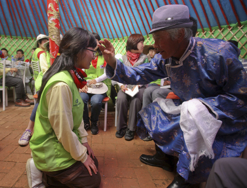 한 자원봉사자가 일을 나가기에 앞서 딤딩스룽 현지 촌장에게서 몽골식 이름을 받고 있다.