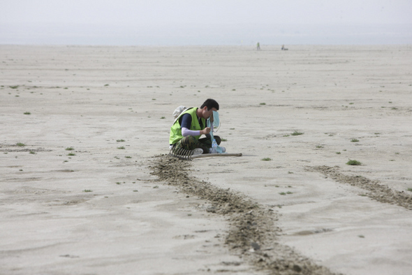 나문재 씨앗을 뿌리던 자원봉사자가 더위에 지쳐 쉬고 있다.