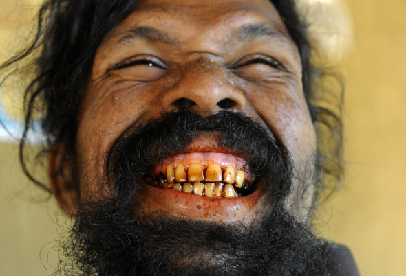 이를 닦지 않는 원시생활을 하는 베다족은 다양한 허브 잎을 씹어 이빨에 빨간 물이 들어 있다.