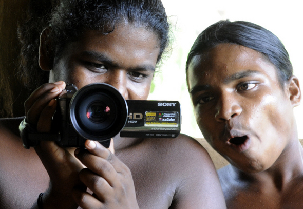 한 베다족 주민이 소형 비디오카메라가 신기한 듯 흥미로운 표정으로 살피며 작동해보고 있다.