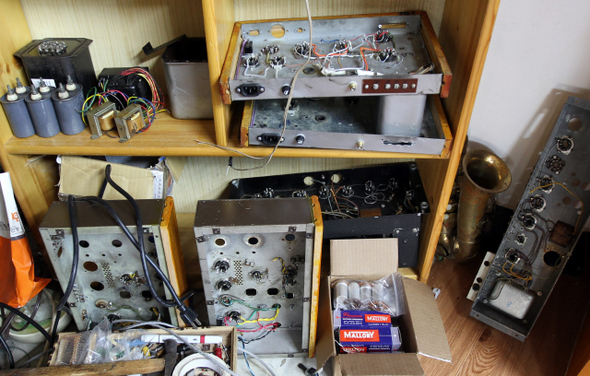 값나가는 멀쩡한 앰프를 부숴 그 부품으로 자신만의 앰프를 만드는 회원도 있다. 그가 보여준 부품 잔해들.한겨레 정용일 기자