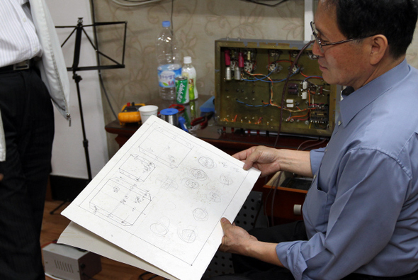 바이올린을 만드는 회원 고종민씨가 도화지에 직접 그린 앰프 설계도를 보여주고 있다.한겨레 정용일 기자