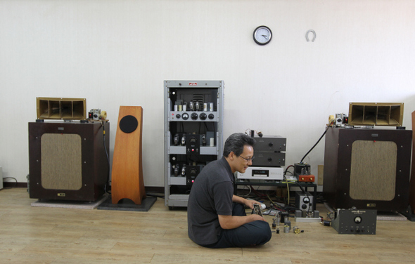 서울 용산구 원효상가에는 오디오 관련 상점이 많이 모여 있다. ‘한국진공관앰프자작동호회’ 회원인 김계중(49)씨도 그곳에서 일하며 진공관 앰프를 만든다. 김씨가 자신이 만든 진공관 앰프 앞에서 예전에 극장용으로 사용되던 스피커를 통해 흘러나오는 음악을 듣고 있다. 한겨레 정용일 기자