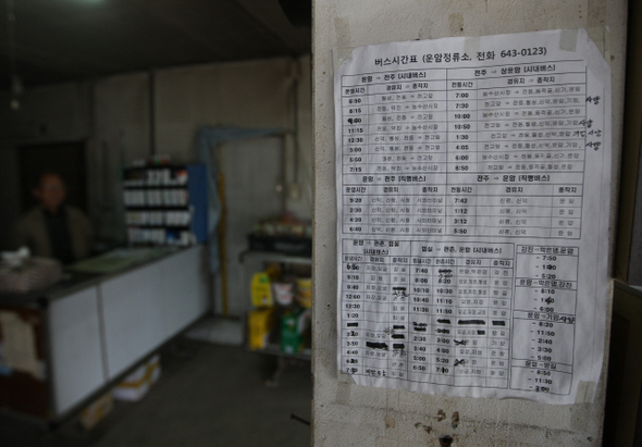 전북 임실군 운암면 ‘운암버스터미널’. 낡은 철제 간판에 쓰인 ‘터미널’이란 문구가 없었더라면 이곳이 버스가 서는 터미널이라곤 생각하지 못할 만큼 후미지고 조그맣다. 이곳에서만 40년 넘게 터미널을 운영해온 김교만(92) 할아버지가 손님이 지나간 자리를 정리한다. 1960년대엔 운암면 인구가 1만 명이 넘었고, 초등학교가 다섯 군데나 있었다. 운암장이 서는 날이면 사람들로 제법 북적였고, 터미널 수입도 꽤 괜찮았다고 한다.