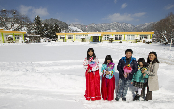 강원도 삼척시 하장초교 갈전분교의 마지막 졸업사진. 2월15일 본교에서 졸업식을 마친 뒤 분교로 돌아와 찍었다. 왼쪽부터 졸업생 최민지양, 김은지양, 최태헌군. 4학년이 되는 남영희양과 황경순 교사가 함께했다.한겨레 김정효 기자 hyopd@hani.co.kr