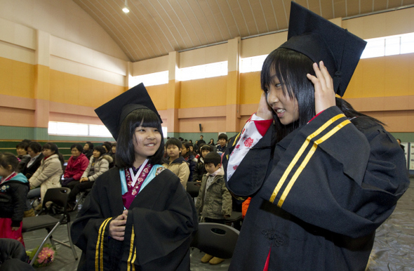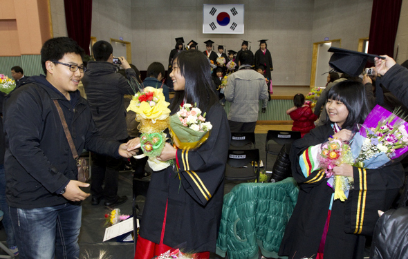 졸업식이 끝난 뒤 민지(가운데)와 은지가 축하를 받고 있다.한겨레 김정효 기자 hyopd@hani.co.kr
